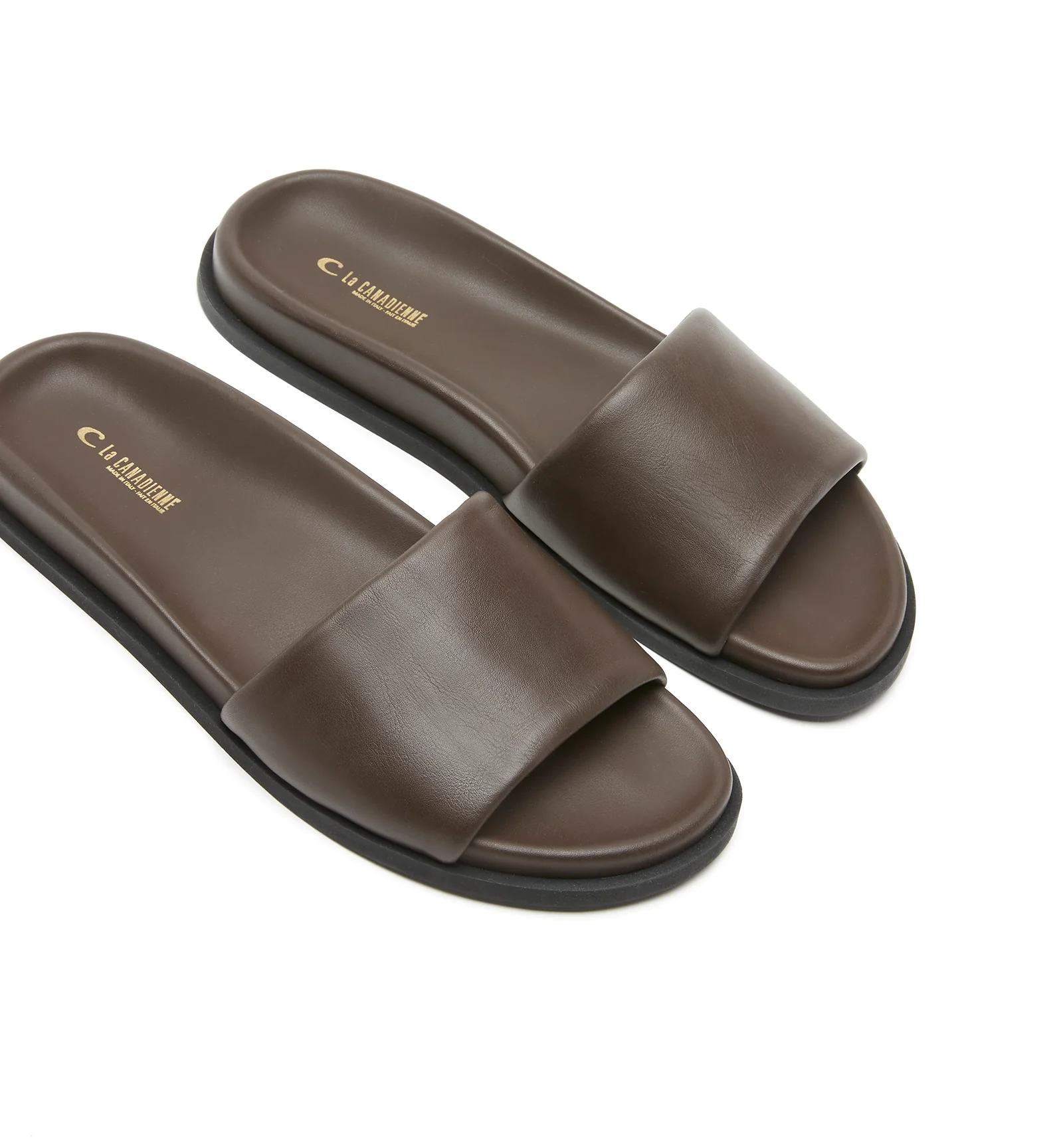 Men’s leather slide sandal featuring a clean single-strap design and cushioned footbed for understated style and everyday comfort.
