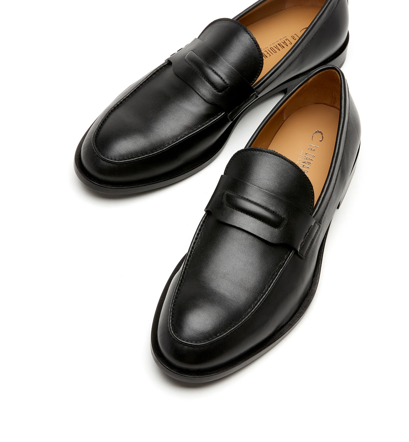 Leather penny loafer with a classic apron toe and a low stacked heel, offering a sharp, timeless finish.